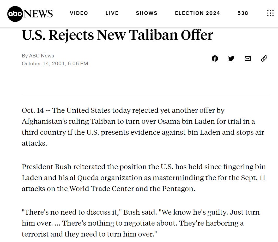 Following the “attacks” of 9/11/01, the US had threatened the Taliban with war if they did not turn over Osama bin Laden. The Taliban offered to do that only if given evidence of his guilt.