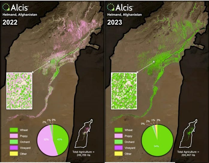 What happened when the US was forced back out of Afghanistan by the Taliban in 2020? The Taliban this year succeeded in shutting down the opium production again by 95% — again, in favor of food production versus extraordinary profits.
