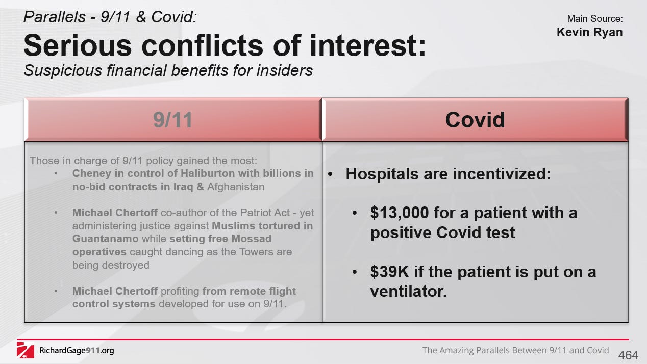 I decided to commit to refining and expanding my full “9/11 & Covid Parallels” speech by recording the 2-hour slide presentation in my webinar format, very soon. Please stand by for this one! This is your opportunity to find out why I’ve become such a “conspiracy theorist”, but be careful - this rabbit hole is even deeper.