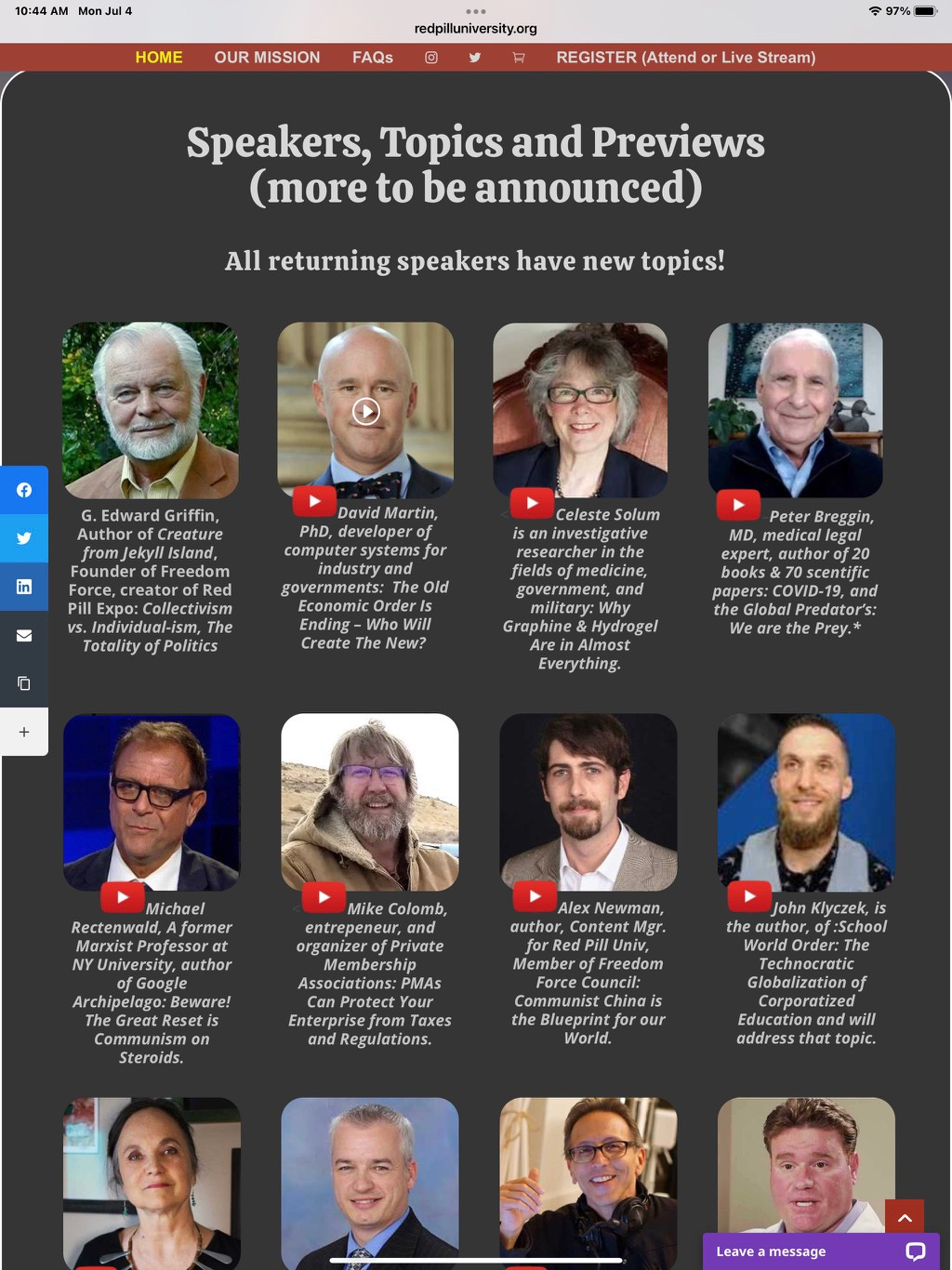 The rest of the speakers were incredible. We heard ground-breaking information on geopolitical and economic conditions that we will never hear on the legacy mainstream media which is occupied by intelligence agencies. We heard the latest startling details on the bioweapons of Covid and the vaccines - experimental genetic therapy. Be sure to see all of these speakers. You can enroll in G Edward Griffin’s Red Pill University at the “Mentor” level which will get you access to all the presentations, and much more!